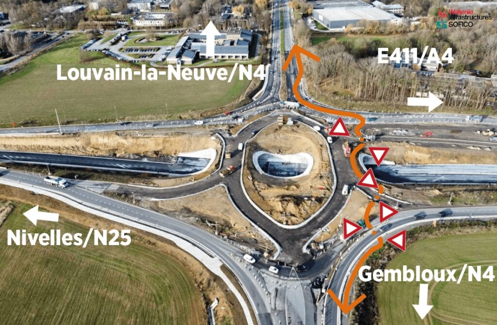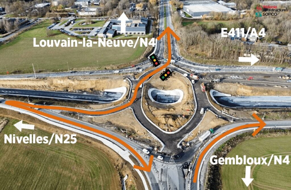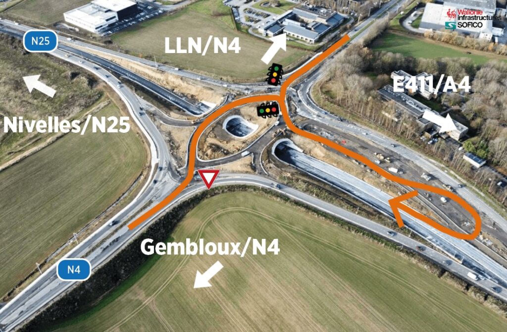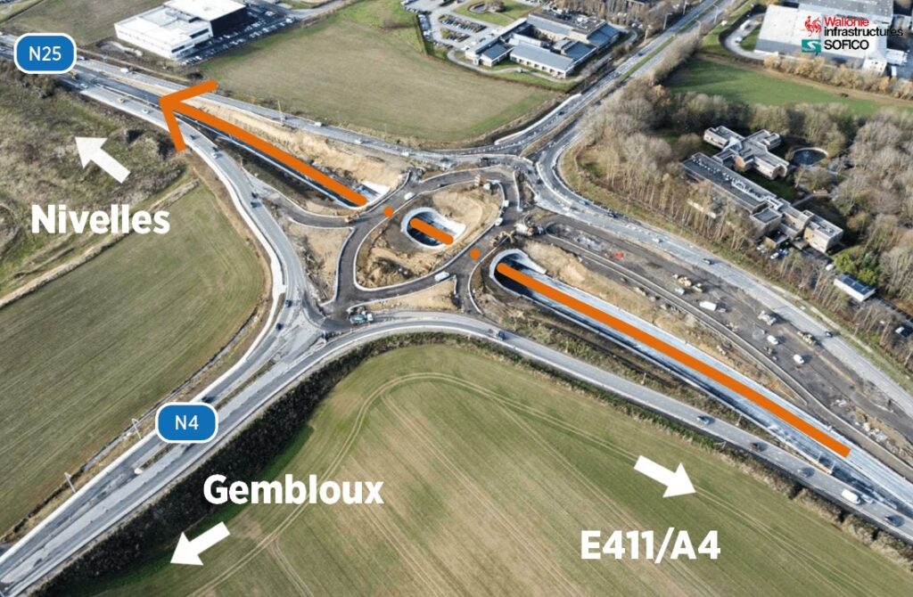 Depuis le 4 septembre 2023 ce chantier vise à réaménager complètement le carrefour formé par la N4-N25 et la sortie d’autoroute de l’E411 afin d’y fluidifier et d’y sécuriser la circulation. Le concept propose de faire passer le trafic principal dans un tunnel, via une double trémie, où passe la N25 qui fait la liaison entre l’autoroute E411 et Nivelles. En surface, via un carrefour « en diamant » et réglé par des feux de circulation, les usagers de la N4 arrivant de Gembloux ou de Wavre pourront aller tout droit, tourner vers Nivelles ou vers l’autoroute.