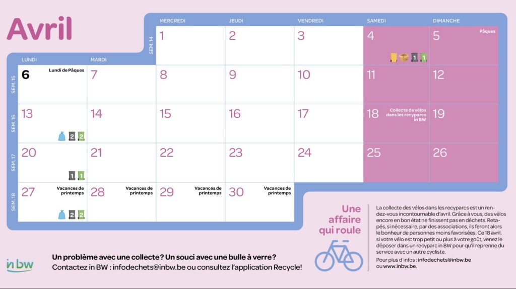 L’inBW, l’intercommunale qui gère la levée des déchets à Chastre, a publié un calendrier complet qui reprend les types de levées par semaine. Pour cette édition 2026, une page est prévue pour chaque mois de l’année avec des petits pictogrammes qui précisent les déchets collectés. On y retrouve également les jours fériés et les vacances scolaires.